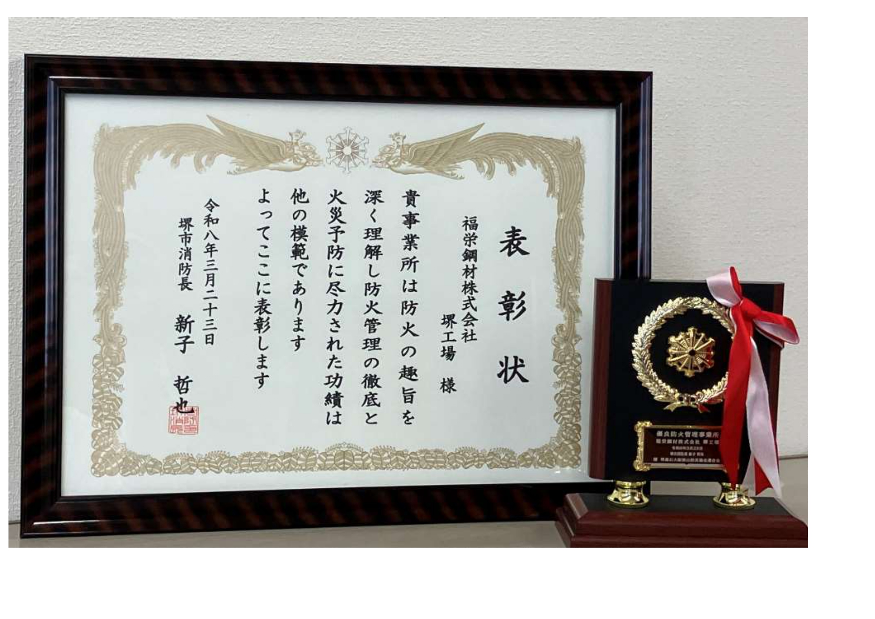 堺工場が、堺市消防署より「優良防火管理事業所」として表彰されました。